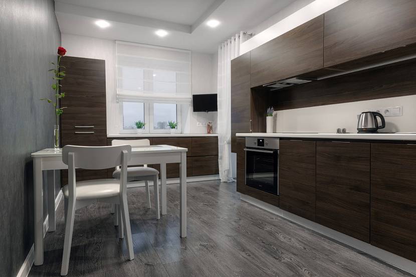 Эти древесные тона идеально вливаются практически во все известные варианты. Серый пол ещё более подчёркивает фактуру дуба, делая её более мягкой, элегантной. Относительно венге – производит впечатление более глубокого, величавого материала.