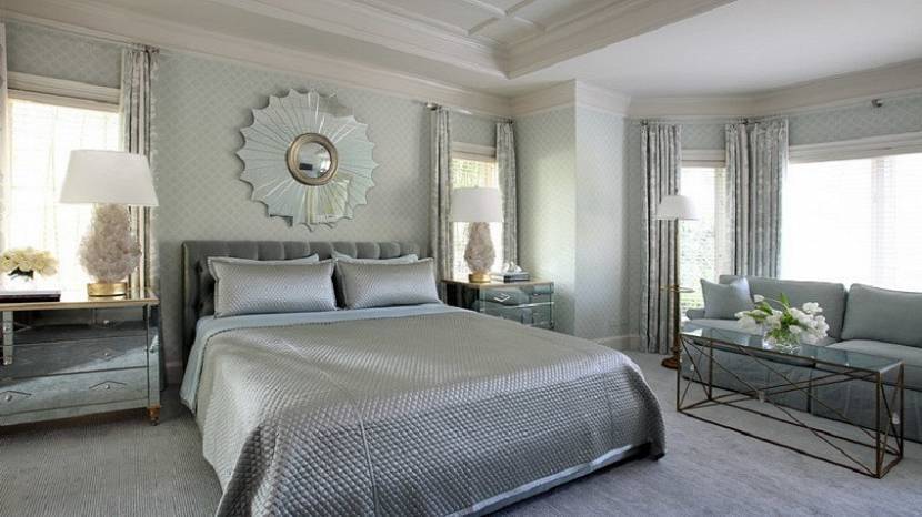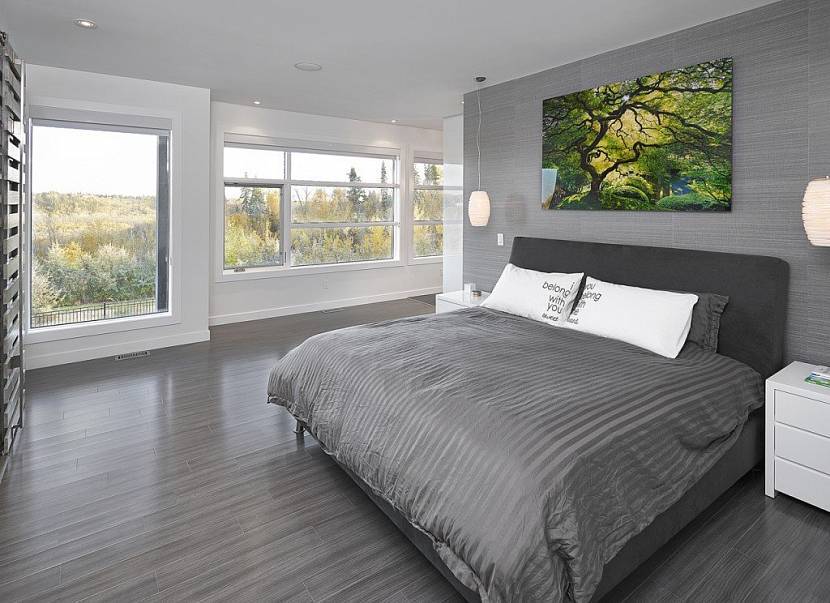 Зонирование изголовья кровати серым ламинатомИсточник skill-spb.ru