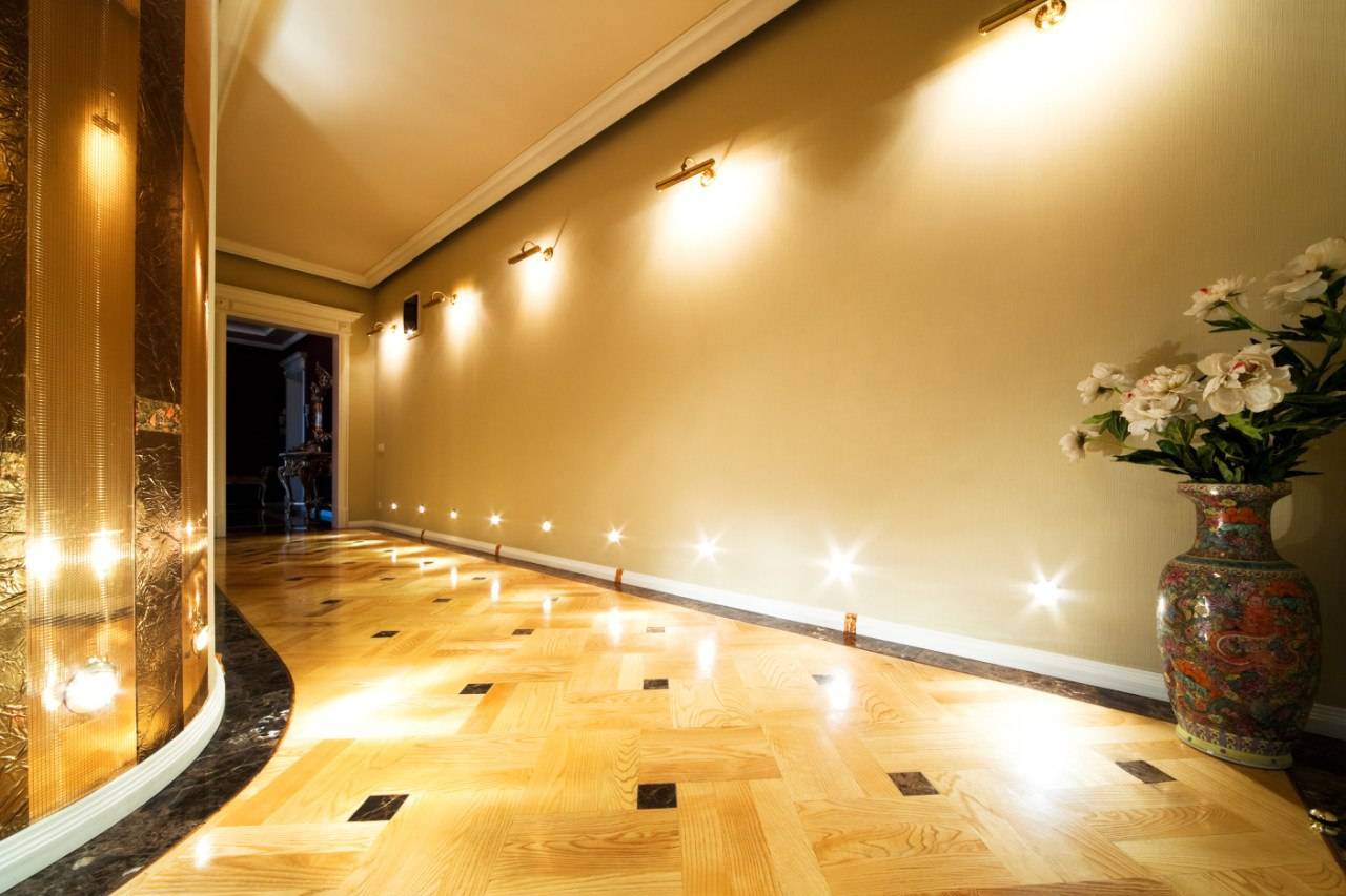 Нетривиальным решением может стать подсветка пола в коридоре, благодаря которой меняется геометрия помещения. Контурный вариант подойдет для лестницы на второй этаж.