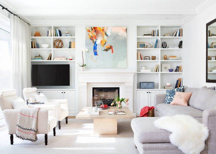 Установить в комнате – нелегкое решение, ведь от его расположения зависит весь дизайн мебели. Настенные телевизоры хорошо смотрятся с открытыми полками, которые делают контрасты менее очевидными.