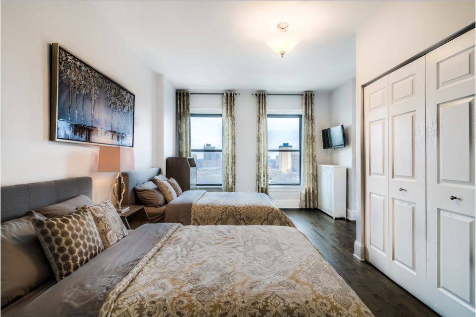 Согласно нормативам, в новостройках ширина спальни должна быть не меньше, чем 2,4 м (откровенно говоря, даже комната шириной 2,6 ― 2,8 м на практике оказывается тесноватой и неудобной). А как быть с легендарными «хрущевками», в которых комнаты еще уже, но по факту ― они существуют? Разработчики СНиП31-01 сделали для них исключение, оговорив для реконструируемых зданий минимальную ширину спален ― 2,25 м. Удачный интерьер такой экстремально узкой спальни ― высший пилотаж дизайнерского искусства.