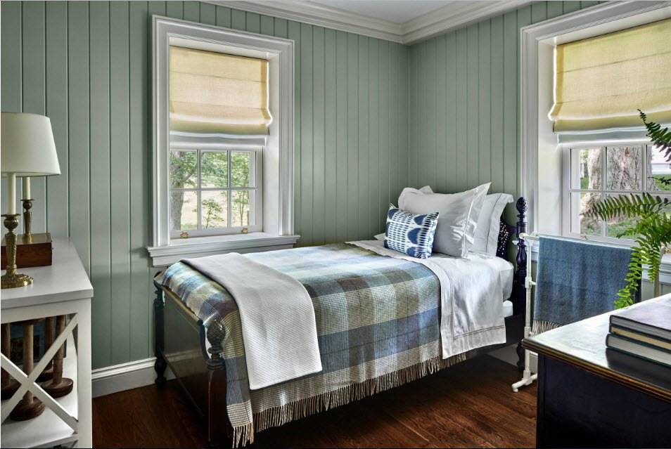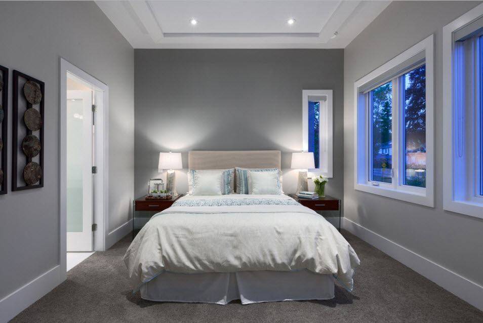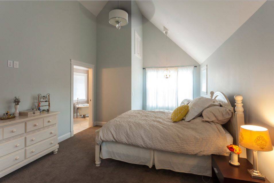 В числе оттенков узкой спальни, которые более предпочтительны: бежевый, кремовый, сиреневый, нежный оливковый, охристый, светло-серый, персиковый, фисташковый. Что касается потолка, его стоит сделать белым, либо нежно-кремовым, молочным, в зависимости от оттенка стен.