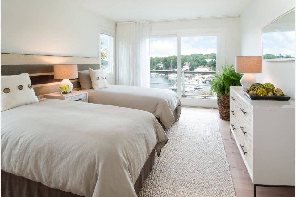 Ставить кровать поперек комнаты стоит и в том случае, если при расположении вдоль остается менее 70 см свободного пространства возле каждого из спальных мест. Узенькие проходы не добавят спальне удобства. Эти сантиметры будут использоваться, что называется, «вхолостую». Если в этой ситуации развернуть кровать поперек, можно оставить полноценные проходы к спальным местам или хотя бы к одному спальному месту. При этом высвободится немало свободного пространства.