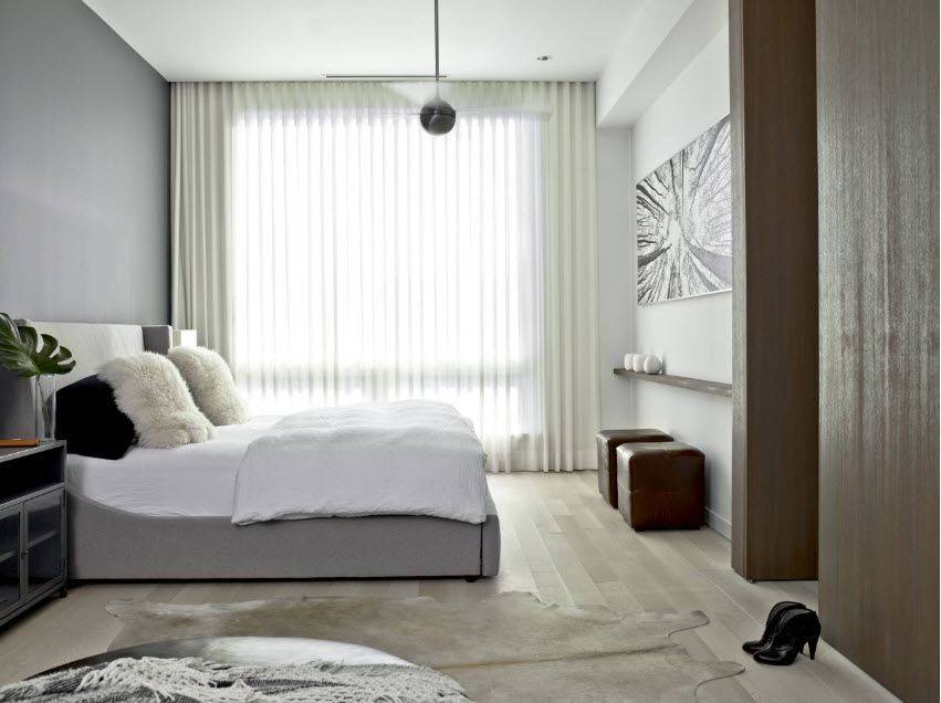Если узкая спальня отличается большой длиной, можно разбить пространство на две зоны. Для разделения зон используют элементы, расположенные поперек комнаты: например, стеллаж, тумбу с телевизором, мини-диван или кресло со столиком. Возможен вариант и с тканевой шторой, выполняющей функцию разделителя. Такое зонирование делает спальню уютнее и гармоничнее.