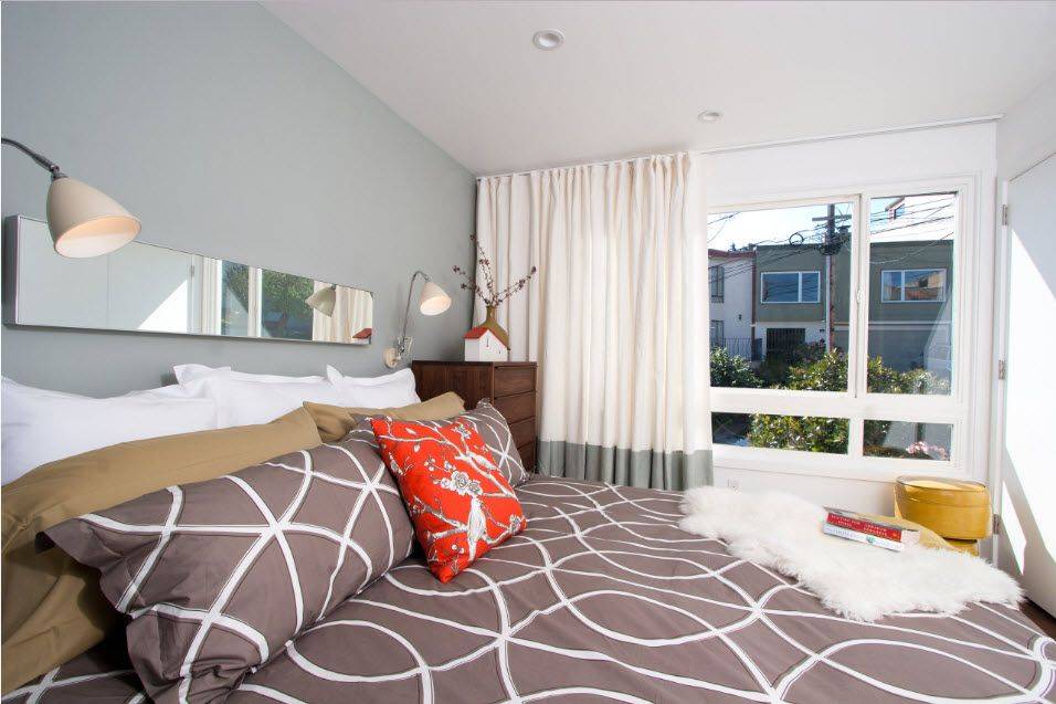 Маленькие хитрости спасают от больших проблем. Такая узкая спальня может стать серьезным испытанием для нервов, если будет темной, заставленной мебелью до состояния «не протиснуться». Поэтому все, что может освободить пространство или создать иллюзию более широкой комнаты – во благо.
