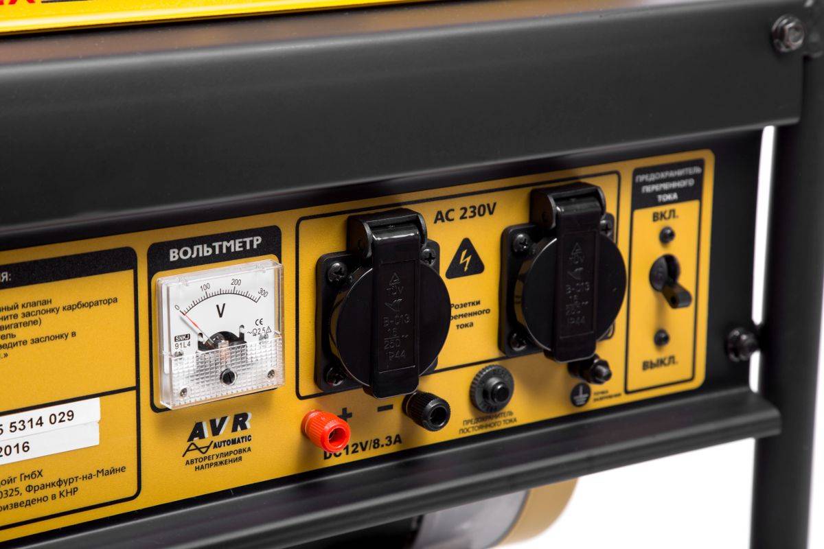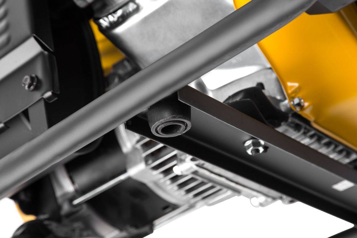 Элементы управления вынесены на информативную панель, а расположенный сверху индикатор топлива позволяет оперативно реагировать на необходимость выполнить дозаправку. Передняя панель усилена, элементы управления утоплены в поверхность и надежно защищены от случайного механического воздействия, что удобно при использовании оборудования на строительной площадке. Эластичные демпферы снизили уровень вибрации, увеличив срок эксплуатации установленного оборудования. Две розетки на 220 В и одна на 12 В обеспечивают простое подключение нагрузки.