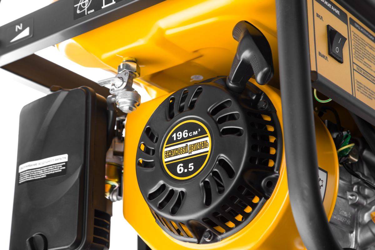 Бензогенератор укомплектовали синхронным альтернатором и четырехтактным мотором 6,5 л.с. Инженеры отдели предпочтение верхнему расположению клапанов, что помогло снизить уровень шума и увеличить межсервисный интервал. Бак вмещает 15 литров топлива, обеспечивая бесперебойную работу на протяжении 10,5 часов. Запуск – с помощью ручного стартера.