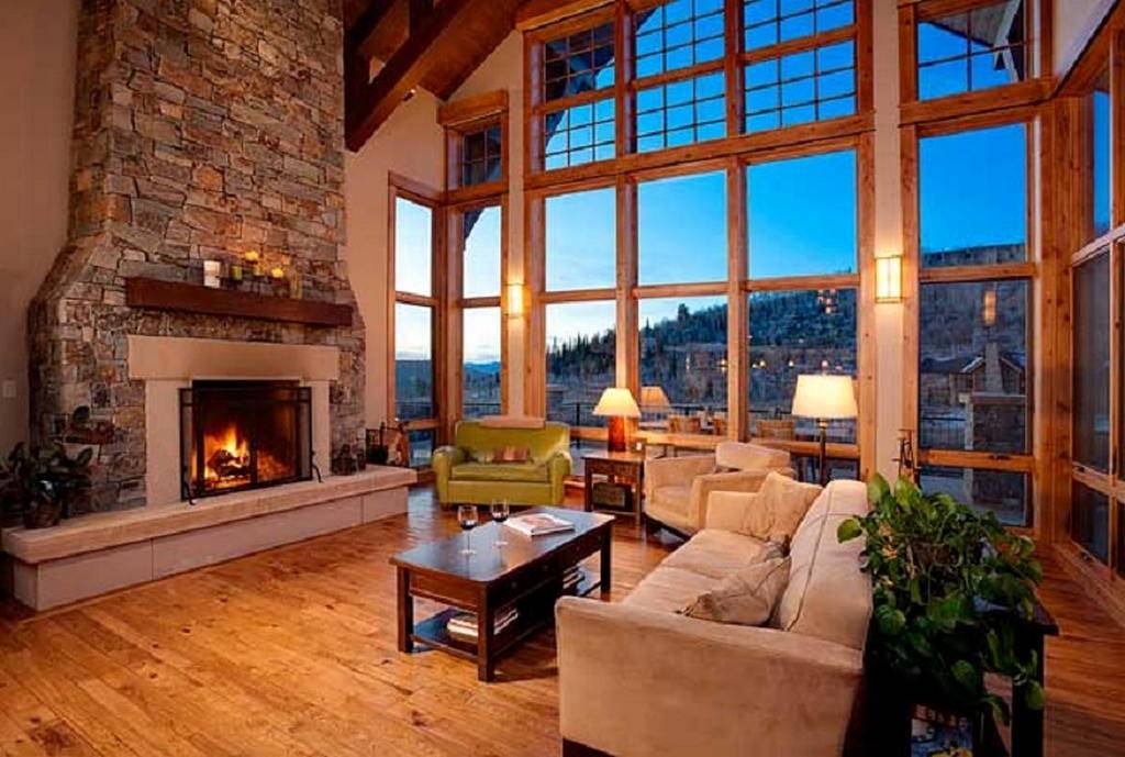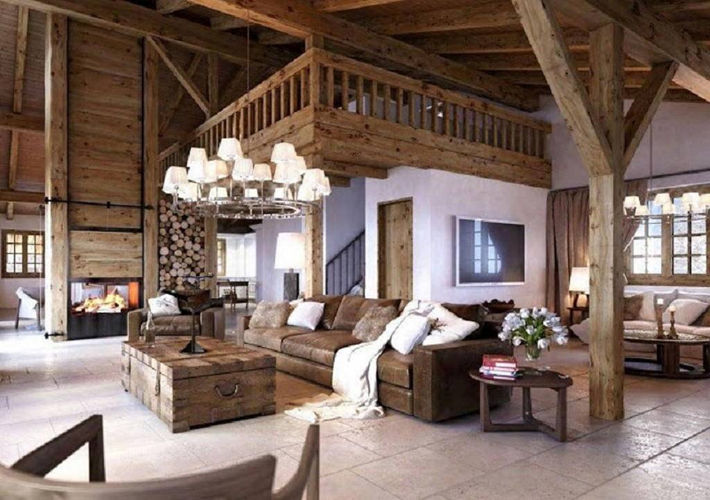 Дизайн такого дома очень простой, самобытный и романтичный. При отделке жилья используется дерево и камень. А чтобы создать дух романтического гнездышка, древесину желательно выбрать искусственно состаренную. По стенам, потолку и полу можно применить деревянные отделочные материалы. Для пола подойдет и камень. Главным декоративным элементом в данном стиле являются балки на потолке, которые выполняются в тон потолка или контрастно к нему. Также для оформления интерьера используются ковры, шкуры зверей, пледы, плетенные вручную – тонкие или толстые. Центральный объект в комнате — камин.