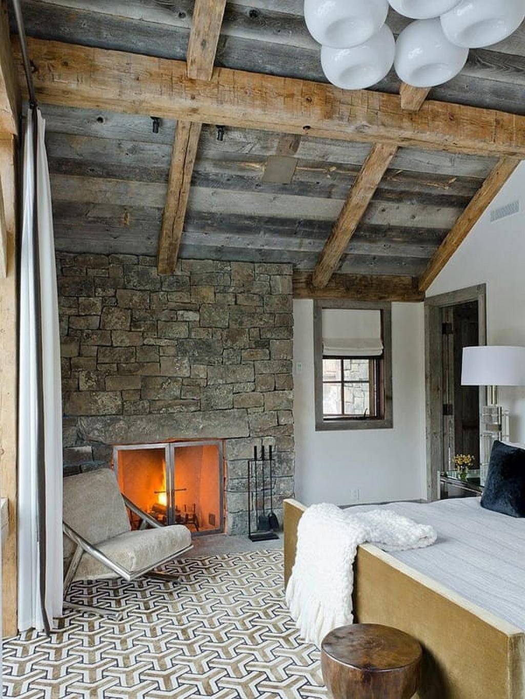 Камин очень часто встречается и в современных спальнях в стиле шале. Правда, его функции теперь чаще всего чисто декоративные. Зона вокруг камина облицовывается камнем.