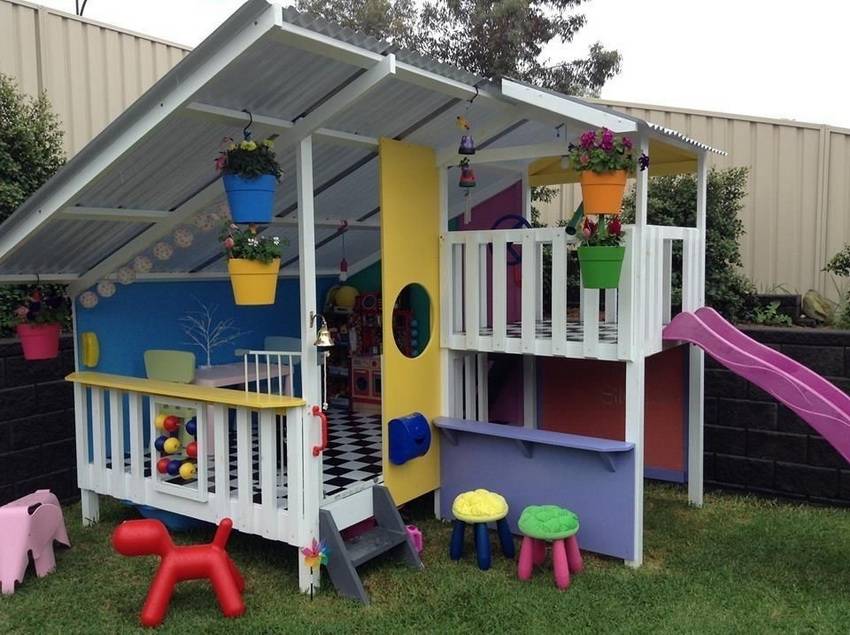 Для постройки домика в два уровня на деревянную раму первого этажа нужно смонтировать наклоненный каркас второго уровня. Его можно выполнить из бруса размером пятьдесят на восемьдесят миллиметров и обшить сверху плитой ОСП. Стандартная высота плиты составляет два с половиной метра, поэтому ее хватит сразу на оба уровня. В нижнем ярусе логично расположить игровую зону, а на втором устроить место для дневного отдыха. Такой домик можно снабдить не только лестницей, но и горкой, превратив его в занимательный аттракцион. Горку легко соорудить из нескольких гладко обструганных досок, покрытых сверху пластиком. Для безопасности малышей по бокам горки следует устроить боковые наклонные бортики.