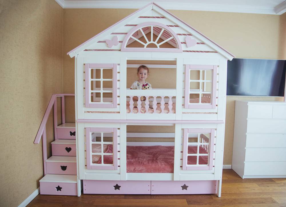 Конструкции самые разные — в основном, варьируется дизайн внешней отделки мебели и расположение кровати. Она будет либо под игровым домиком, либо над ним.