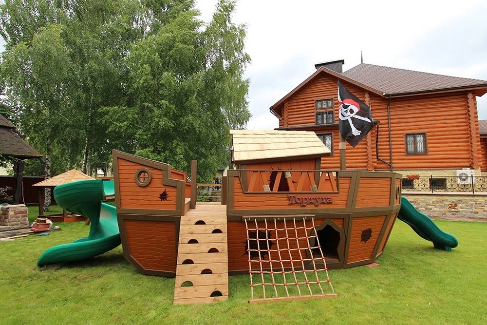 Для тех, кто не боится сложностей, подойдет идея сооружения домика в виде корабля, оснащенного штурвалом, иллюминаторами, веревочными лестницами и мачтами.