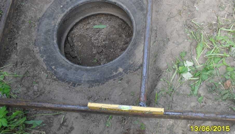 Для упрочнения фундамента перед заливкой бетона лучше всего выкопать ямки по углам конструкции на глубину полтора метра. В них вставить металлические сваи или трубы длиной 1,7 м, которые должны выступать на 0,2 м от поверхности земли. Затем в трубы вставляют металлические или деревянные колья, которые послужат каркасом душевой кабины. Их размер — 2,5 м в длину и 0,1 м в диаметре.