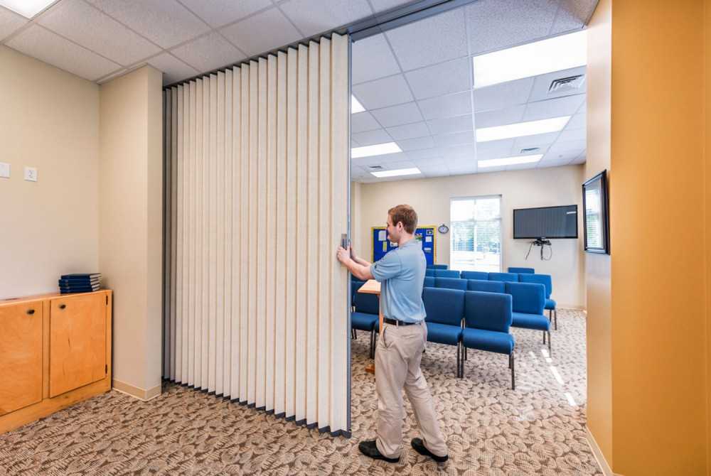 Если возникла необходимость в зонировании пространства, то раздвижные двери гармошка будут отличным вариантом. Благодаря конструкции они компактны, не занимают лишнего пространства. Особенности устройства в том, что в открытом виде частично освобождается проход, другая часть его остается загороженной. При этом не происходит распахивания наружу или внутрь. Складывание одностороннее.