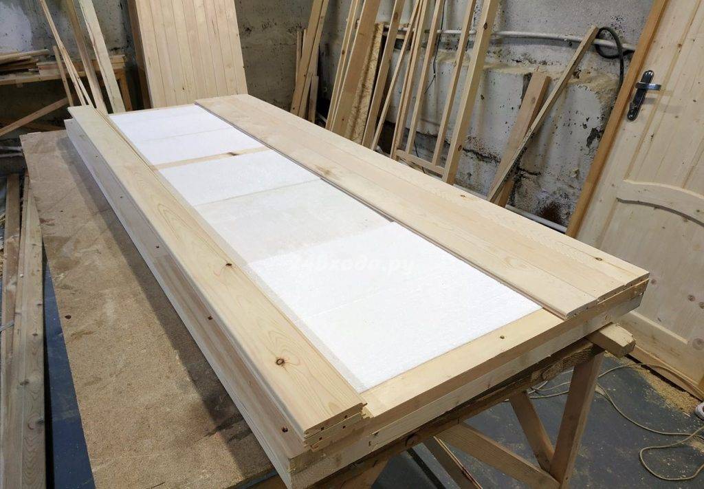 При изготовлении такого полотна стоит учесть, что для его утепления теплоизолирующую прослойку нужно поместить внутри двери. Поэтому нужно заранее приготовить лист ЭППС или другой материал. Раму сделать из бруска 3х3 см: