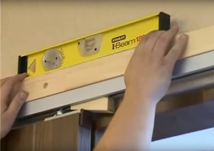 - Мастер проверяет корректность фиксации, так как полозья должны устанавливаться строго горизонтально. В противном случае, створка начнёт отъезжать сама собой, под действием гравитационных сил.