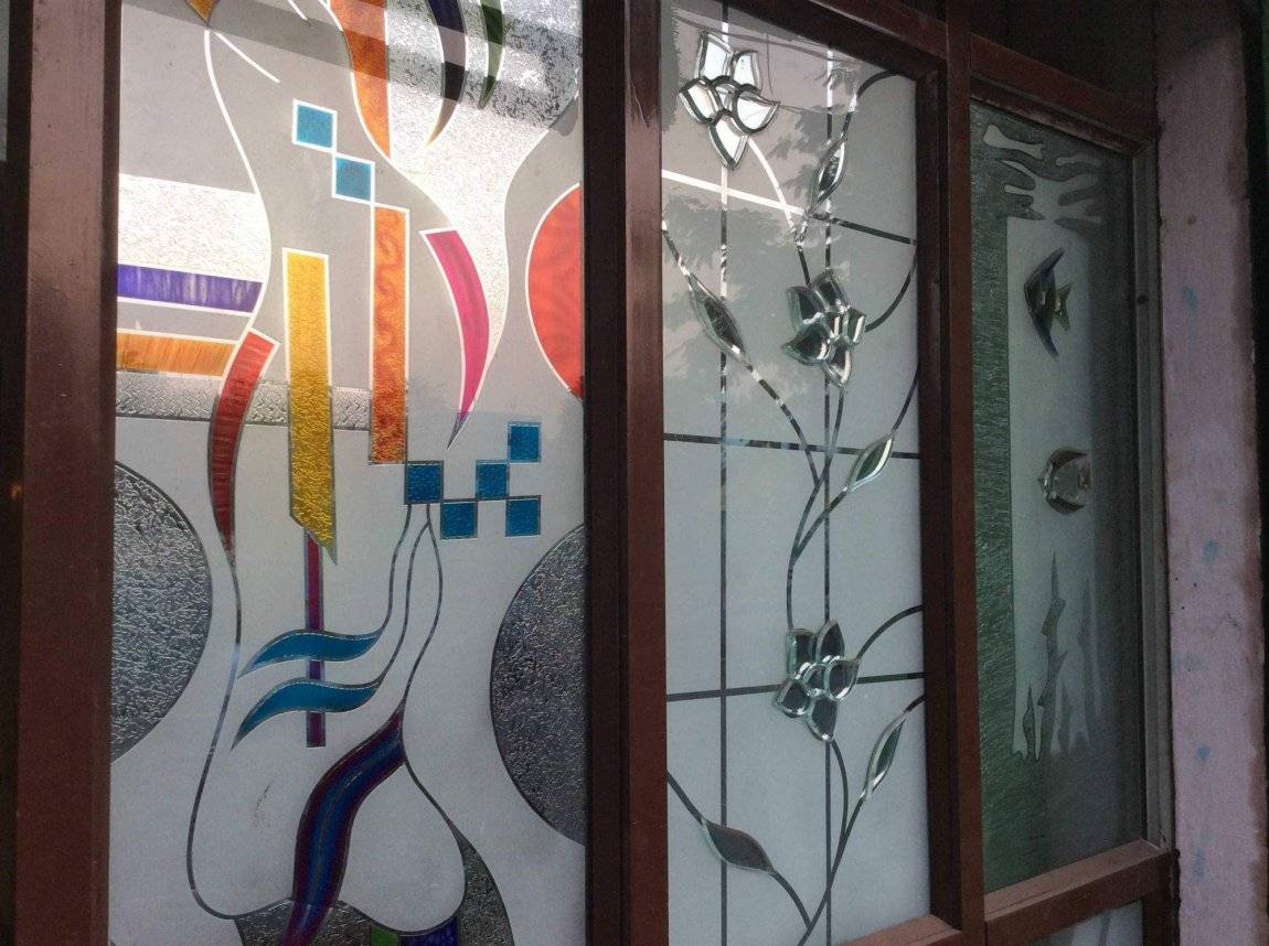 Стеклянные полотна используются как в петельных конструкциях, так и в виде дверей-купе. Они могут быть украшены ручной росписью, фотопечатью, быть разных цветов, состоять из мозаики или представлять витражи. В любом случае подобные изделия – удовольствие не из дешевых и чаще всего выполняется на заказ под конкретный интерьер и желания владельца.
