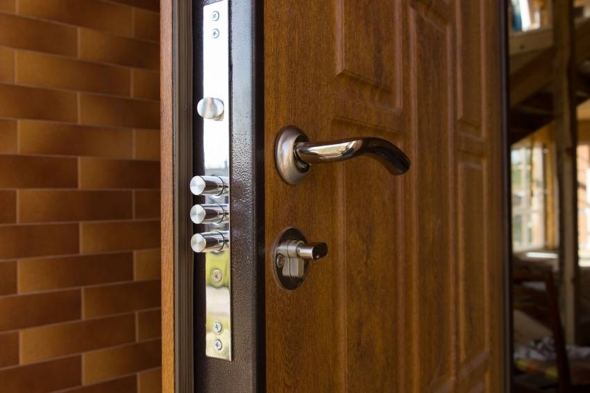 запорный механизм – обычно устанавливается надежный замок с мощными ригелями для запирания и блокирования двери;