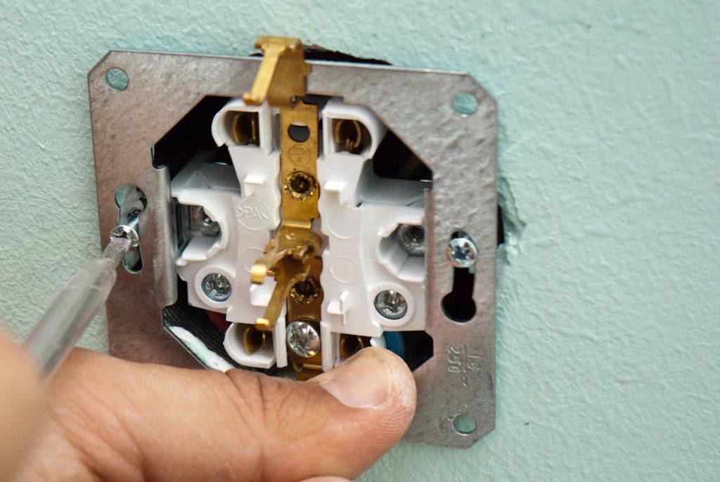 1. Отключите электричество! Для этого в электрощите, необходимо рычаги автоматических выключателей перевести в состоянии «выкл.», обычно это положение, при котором рычаг направлен вниз. Какой именно автомат необходимо выключить, если они не подписаны, определяется опытным путем, выключая их по очереди, и проверяя, например индикаторной отверткой, наличие напряжения в проводке розетки. В крайнем случае, выключайте все. Но затем обязательно убедитесь, в отсутствии электрического тока, в месте установки!