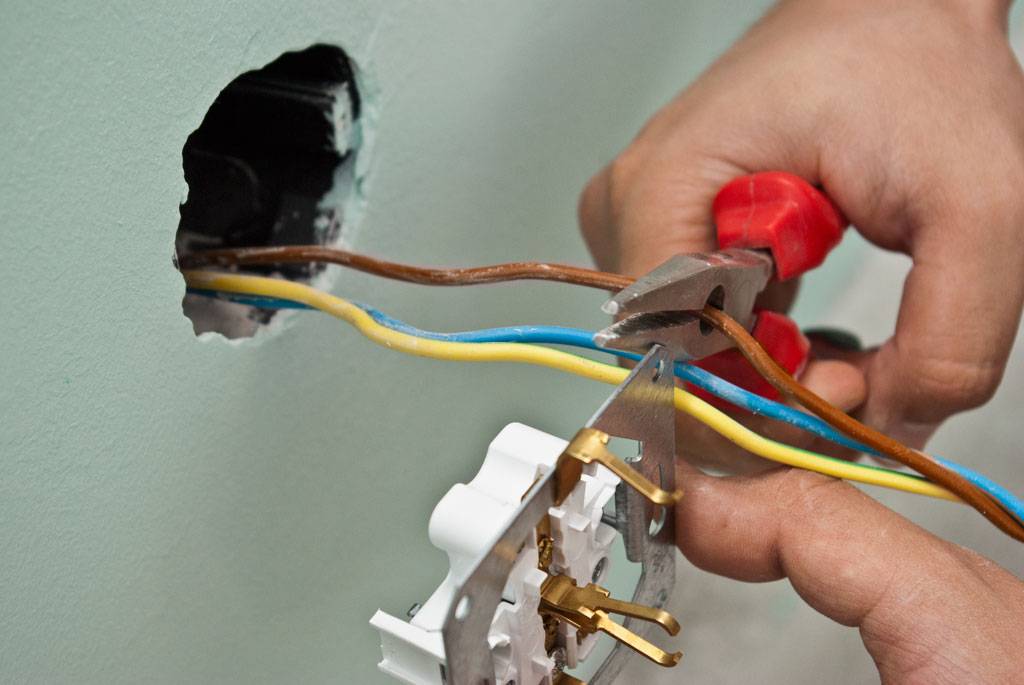 3. С помощью пассатижей или бокорезов, укорачиваем провода в подрозетнике , чтоб их длинна составляла примерно 10см. Затем снимаем с концов изоляцию на 8-10мм, и, для удобства подключения, подгибаем провода как показано ниже.