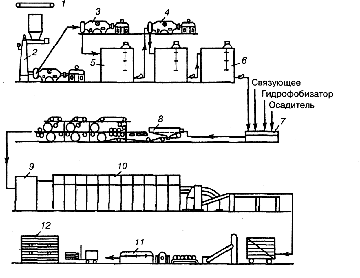 Рис. 4. Схема технологического процесса изготовления мягких плит: 1 – конвейер для подачи щепы; 2 – дефибратор; 3 – рафинатор; 4 — мельница третьей ступени размола; 5 – промежуточный массный бассейн; 6 — расходный массный бассейн; 7 – ящик непрерывной проклейки; 8 – отливная машина; 9 – загрузочное устройство; 10 – роликовая сушилка; 11 – форматно-обрезная установка; 12 – штабель плит склада готовой продукции.