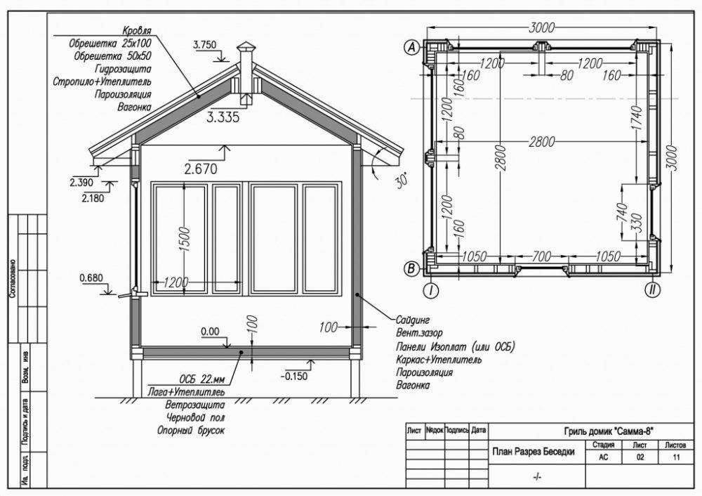 Рабочий проект (технический чертеж). Составляется для тех, кто будет строить беседку, поэтому содержит максимум информации: тип фундамента и кровли, схемы и размеры, нюансы и материалы. Отдельно составляется план коммуникаций (подвод и сток воды, освещение).