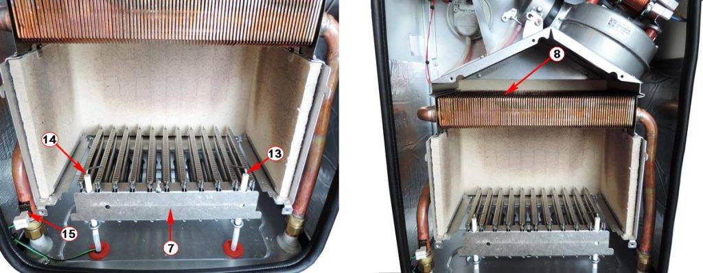 Внутри камеры сгорания расположена газовая горелка (7), основной теплообменник (8), электрод контроля пламени(14), электрод розжига(13). На стенках камеры сгорания закреплены листы из огнеупорного теплоизоляционного материала с целью минимизировать нагрев других внутренних элементов котла от работающей горелки, расположенных за пределами камеры сгорания.