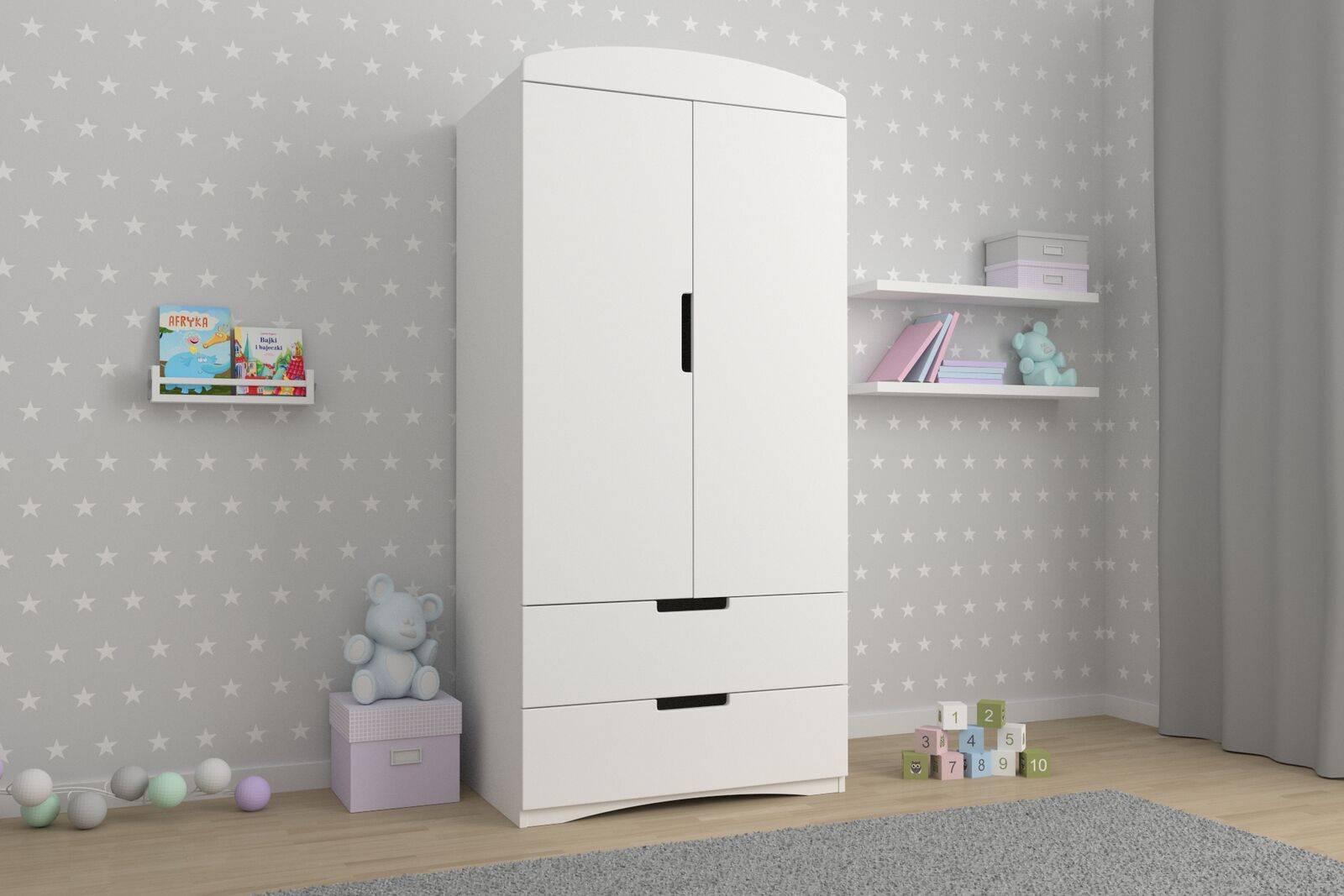 При эксплуатации мебельного изделия в спальной комнате на полках, кроме одежды, вполне можно разложить несколько комплектов постельного белья. Особенно удобным окажется двухстворчатый шкаф для детской комнаты, поскольку не займет много места и позволит хранить не только одежду, но и игрушки.