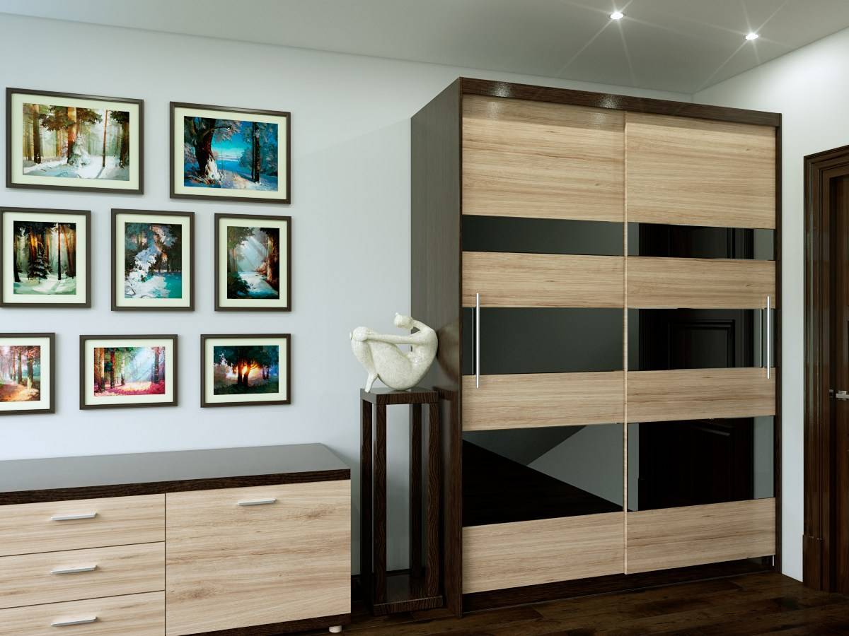 - зеркальная вставка на дверцах не только поможет Вам подобрать наряд, но и «расширит» площадь;