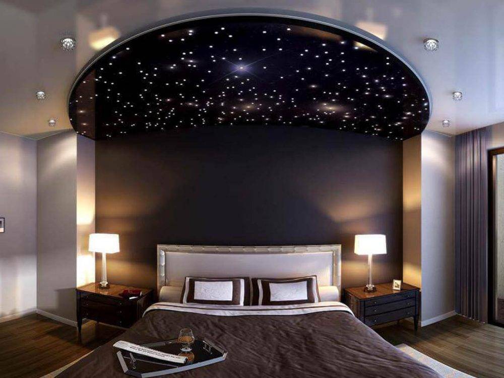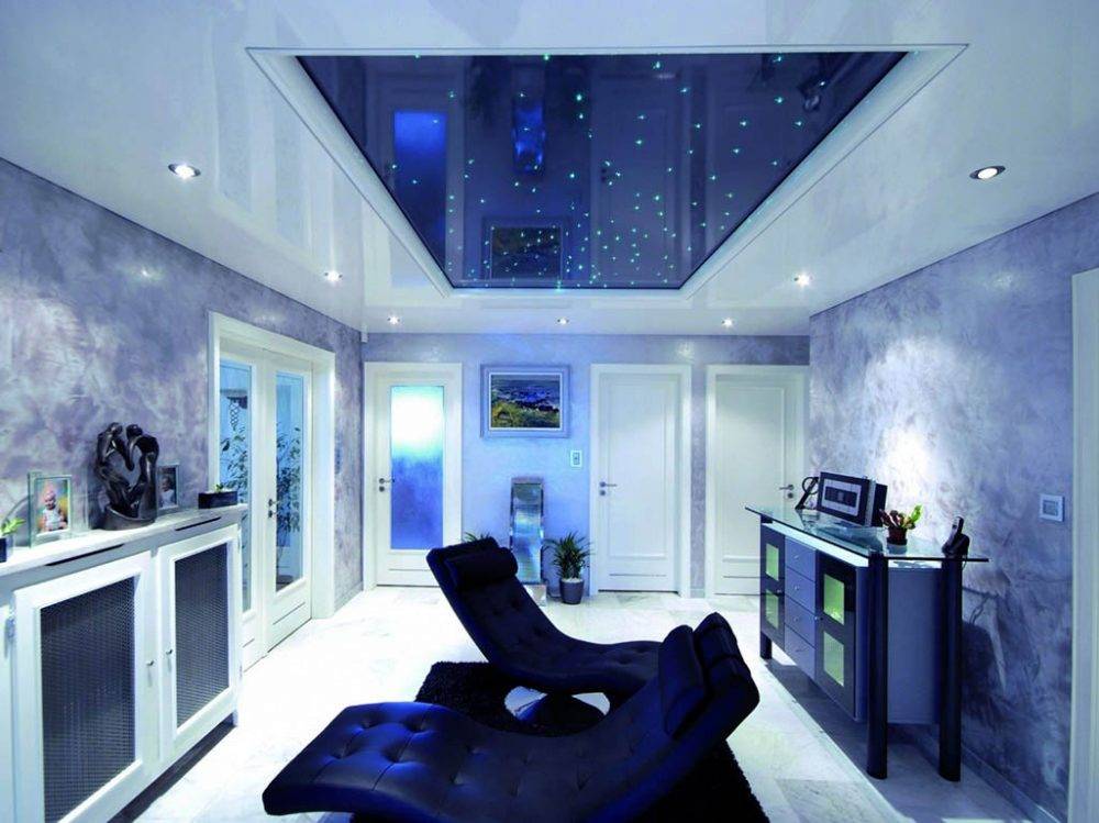 - «Звездное небо». Двухуровневый потолок с удивительным звездным свечением. Для создания такого эффекта могут использоваться светодиодные ленты и оптоволоконные нити, а также светильники-хрусталики. Вы сможете сделать свечение разноцветным или одноцветным;