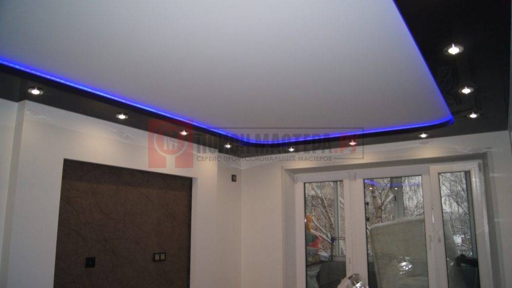 Вы уже знаете, что двухъярусный натяжной потолок состоит из гипсокартонного короба. Дизайн короба может быть абсолютно любым: встречаются круглые, изогнутые, традиционные прямоугольные и даже смешанные формы. А также вы можете заказать короб со специальной нишей для подсветки или обойтись без нее.