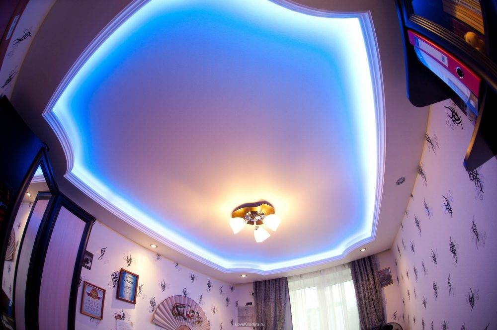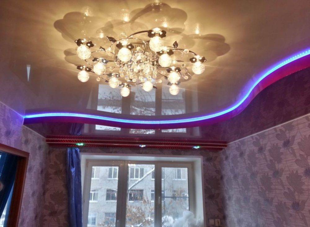Конструкция выполняется по предварительно созданному эскизу, вариантов которого может быть множество. В настоящее время очень популярны двухуровневые потолки с подсветкой.