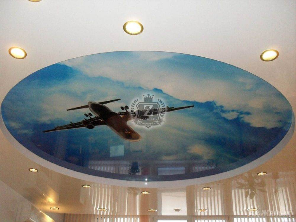 - натяжные потолки для зала с напечатанными на них фотографиями и рисунками. Современные технологии широкоформатной печати позволяют нанести на потолочное покрытие абсолютно любой рисунок.