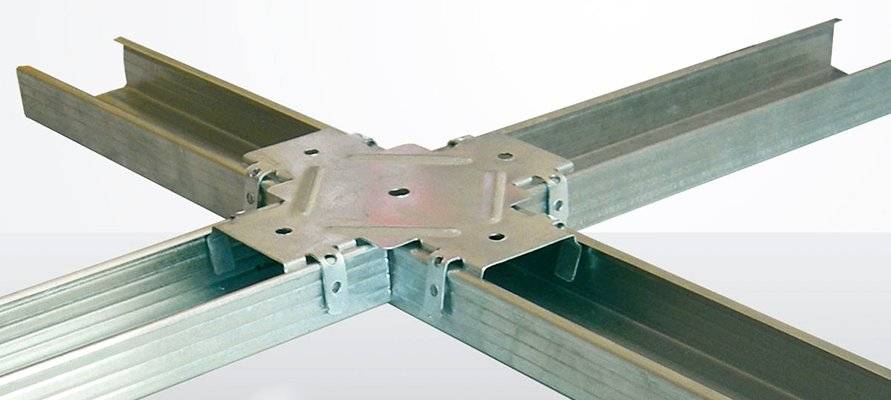 - далее к подвесам и UD-профилю фиксируют потолочные профили CD на саморезы. Для стыковки профилей тоже используют саморезы. Чтобы исключить провисание потолочного профиля, каждую CD-планку подтягивают средними подвесами, «уши» которых подгибают под профили;