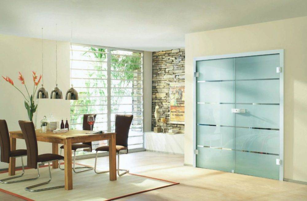 Стекло. В качестве основы дверных полотен используется высокопрочное стекло – триплекс, которое зачастую либо не имеет рамы, либо обрамляется алюминиевым профилем. Двойные двери могут быть как из прозрачного, так и цветного, матового стекла. Их рекомендуют устанавливать в небольших помещениях, где требуется визуальное расширение пространства.