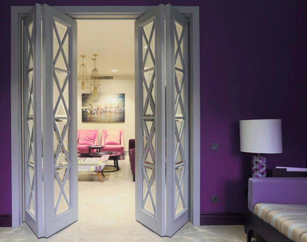 Складные. Такая дверная система включает в себя створки, которые способны складываться по типу «гармошка». Это необычный, и в то же время экономичный вариант межкомнатных дверей.