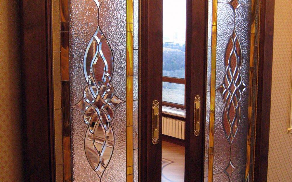 В качестве вставок часто применяют витражное стекло, изысканное и роскошное. Для усиления впечатления над дверной коробкой монтируют полукруглую арку, украшенную такими же стеклянными элементами. Чаще всего цвет дверного полотна и фурнитуры перекликается с оттенками, присутствующими в мебели.