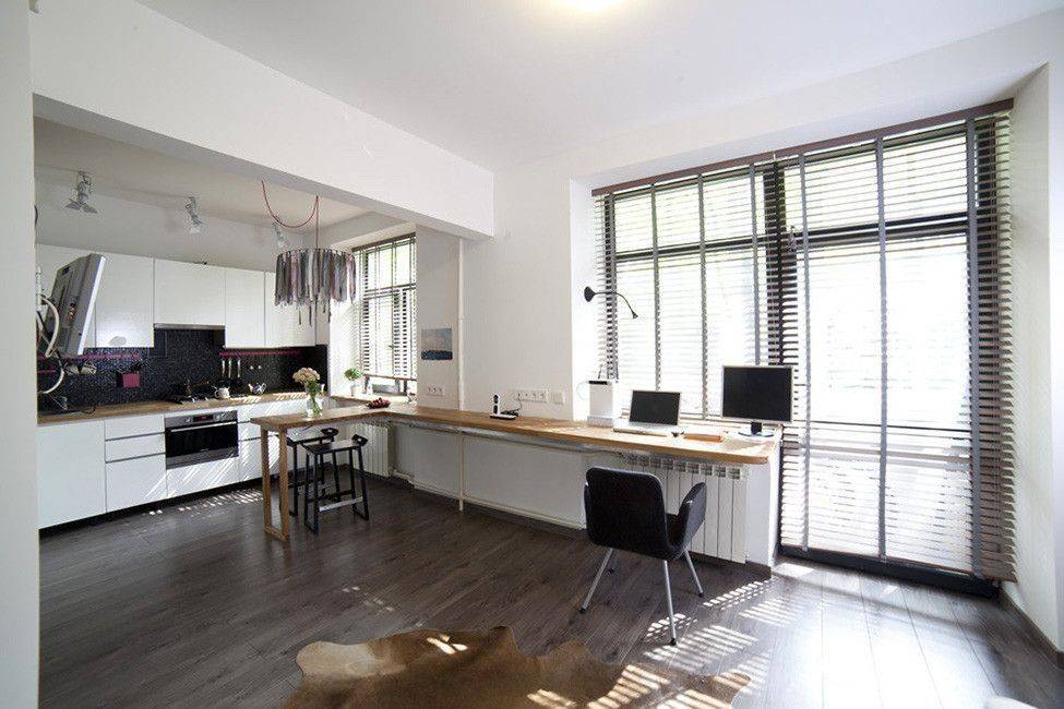 - Комната с лоджией. Для малогабаритной студии лоджия – находка, позволяющая увеличить полезную площадь. Её утепляют, а затем оформляют в едином стиле с остальным пространством. В лоджии организовывают спальное место, уголок отдыха или рабочий кабинет. Стену с внутренним окном иногда демонтируют полностью, иногда частично оставляют, чтобы получить оригинальную деталь интерьера.