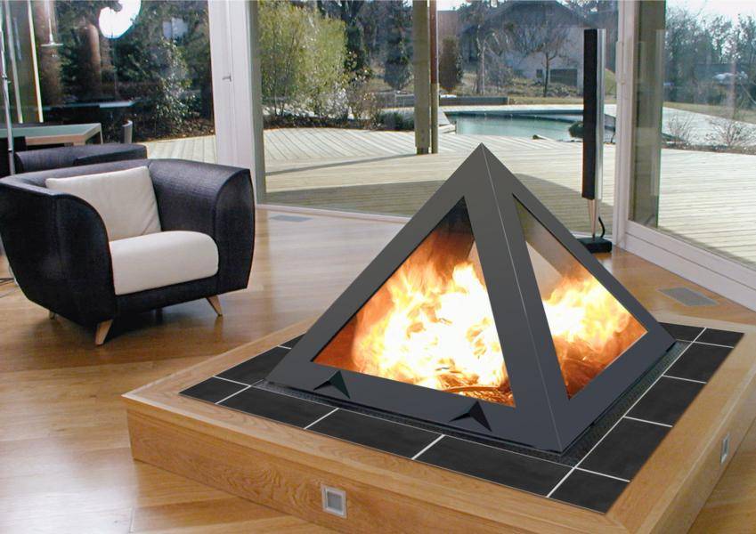 В интерьер дома, оформленного в стиле хай-тек, отлично впишется биокамин в форме пирамиды.