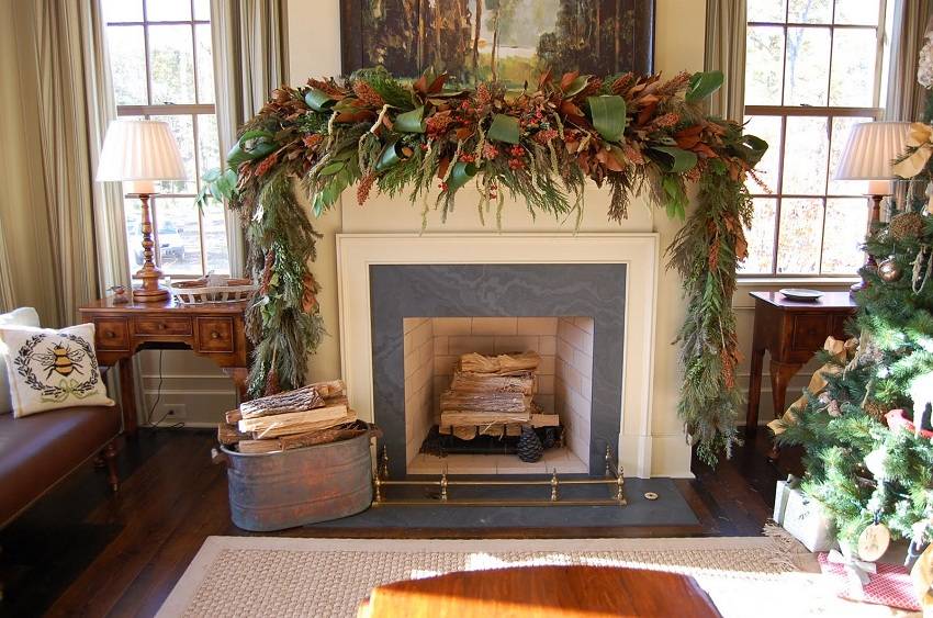 Устанавливаем камин возле стены и приступаем к декорированию. Для этого можно использовать еловые веточки, мишуру, красивые свечки и другие праздничные атрибуты.