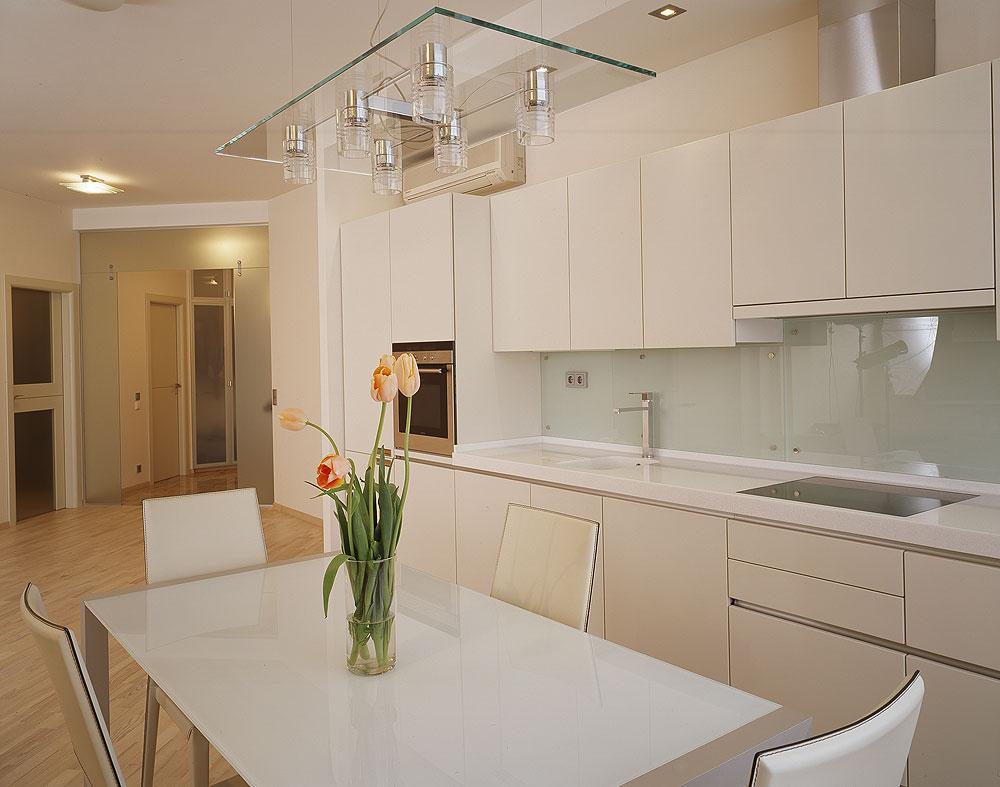 - материалы для белого легче собирать. Фартук для белой кухни следует выбирать в светлых тонах. Это сделает пространство живым и веселым.