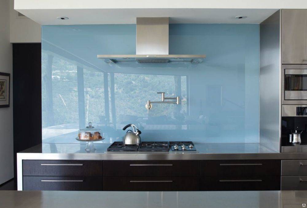 Стеклянная отделка дешевле каменного и металлического фартука.