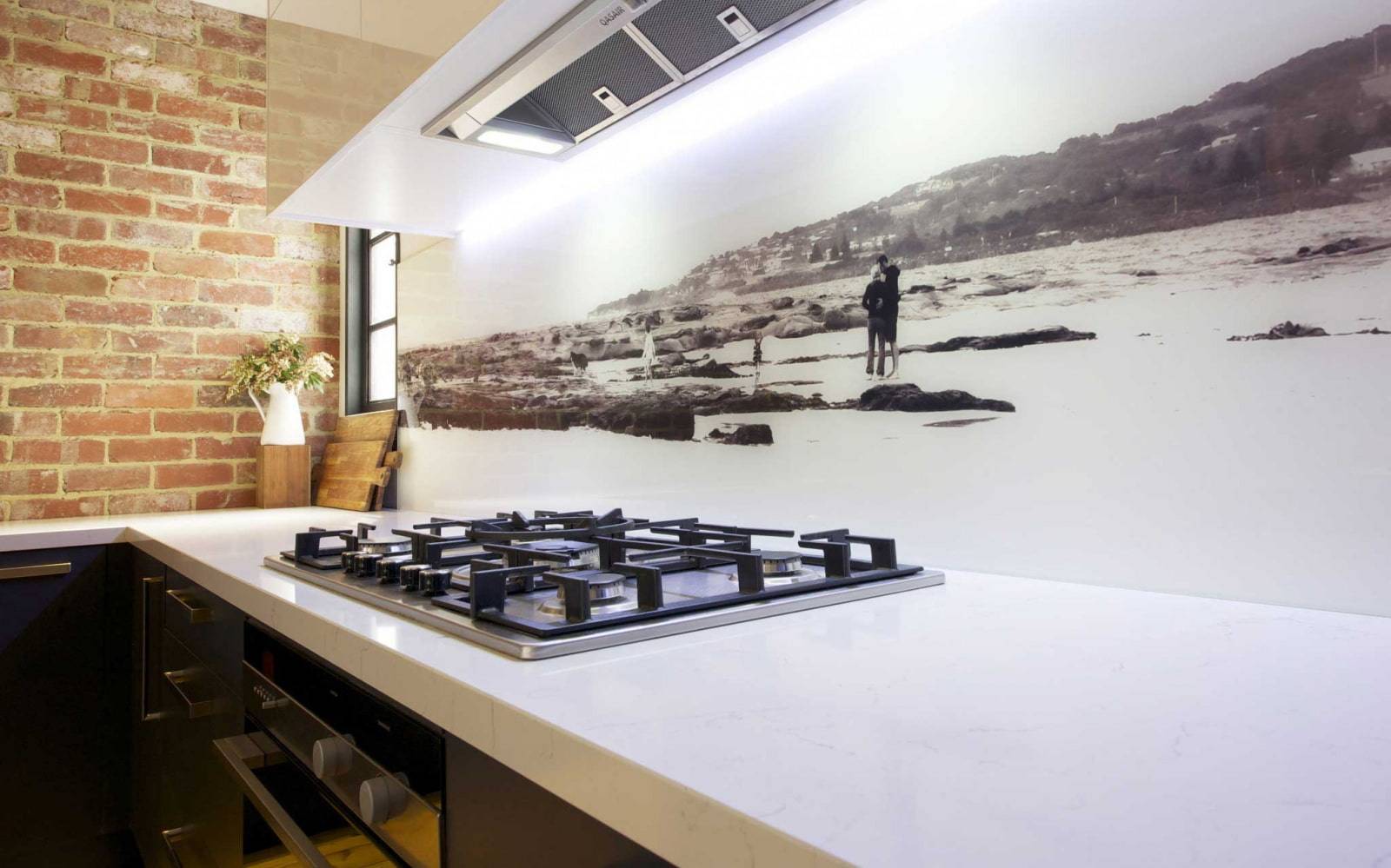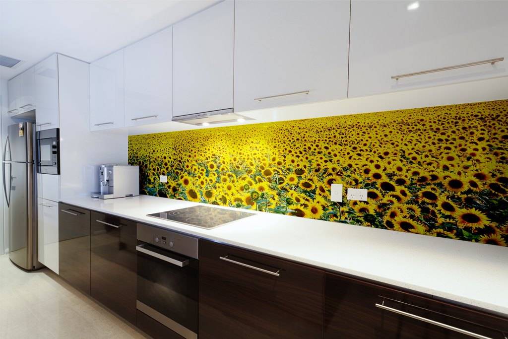 - Оргстекло – точнее говоря, панели из акрила и поликарбоната. Фотопечать на них обладает теми же достоинствами, а вот сам материал несколько отличается. Превосходя силикатное стекло по прочности и безопасности, пластик проявляет склонность к деформации при нагреве. Такой вариант рекомендуется для кухонь с электрической плитой либо индукционной варочной поверхностью. На фото ниже – акриловые панели с фотопечатью на кухне.