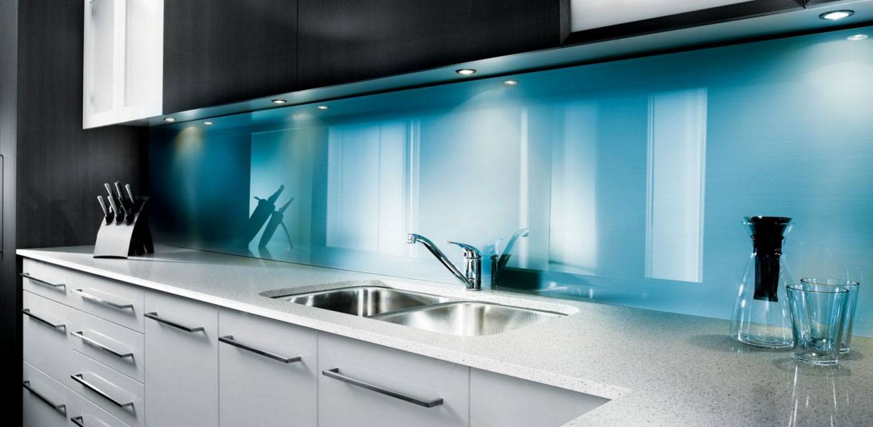 Стеклянные панели – подразумевается их изготовление из закаленного стекла, так как обычное является слишком хрупким и опасным материалом: при повреждении рассыпается на острые осколки. Закаленное – намного прочней, а осколки, если таковые появятся, имеют закругленные края и куда менее опасны. На фото – скинали из закаленного стекла.