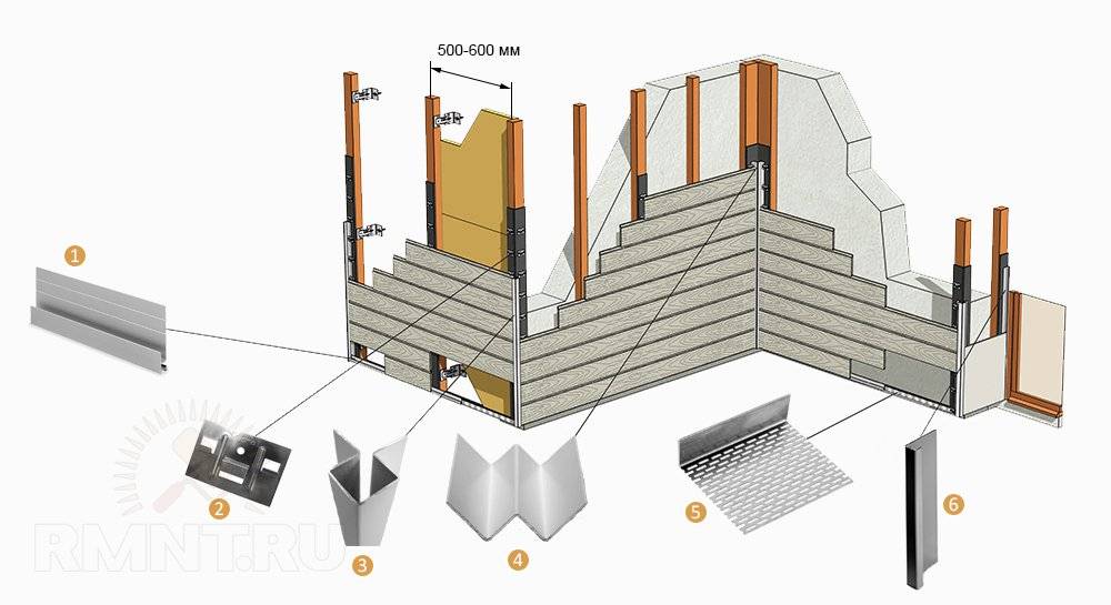 Установка производится из горизонтальных планок. На вертикальные крепится сайдинг. Для каркаса подходит металлический профиль или брус из дерева. Выбор зависит от масштаба работ и сложности фасадной конструкции.