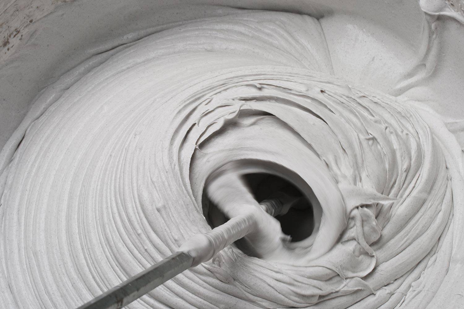 Разбавляется 25 килограмм шпаклевочной основы в девяти литрах воды. Размешивать смесь стоит с помощью перфоратора или дрели со специальной насадкой-миксером до густого (но не твердого или жидкого) состояния. После этого она должна настояться в течение 10 минут, загустеть и опять быть перемешена.