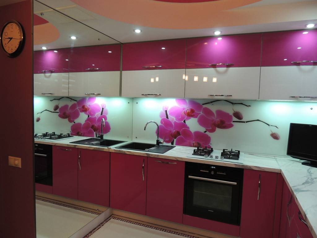 Ни в коем случае нельзя устанавливать в таком помещении фиолетовые натяжные потолки, которые создадут ощущение плотно закрытой коробки. Также не следует выбирать массивную подвесную люстру — лучшим решением станет небольшой потолочный светильник из стекла. Украсить кухню можно с помощью такой детали, как большие часы, цифры и стрелки которого монтированы прямо на стену.
