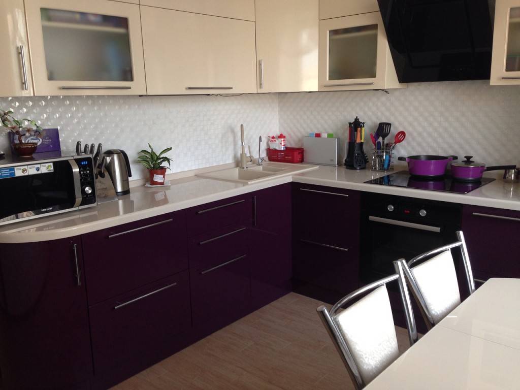 Кухня светлых тонов с фиолетовой столешницей — элегантное решение, хороший пример грамотно расставленных в жилище цветовых акцентов. В фиолетовом цвете можно обустроить рабочую поверхность и установленный в центре обеденный стол. Стоит также использовать несколько декоративных элементов фиолетового цвета.