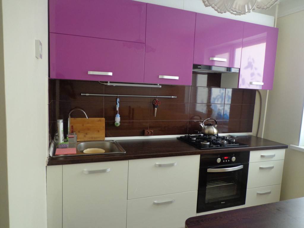 Выбирая мебель для небольшой и тесной кухни в фиолетовых тонах, следует учитывать ее реальную эргономичность. Рекомендуется подобрать высокий гарнитур из легких материалов с хорошей вместительностью и с глянцевыми поверхностями фасадов (нижние могут быть фиолетовыми).