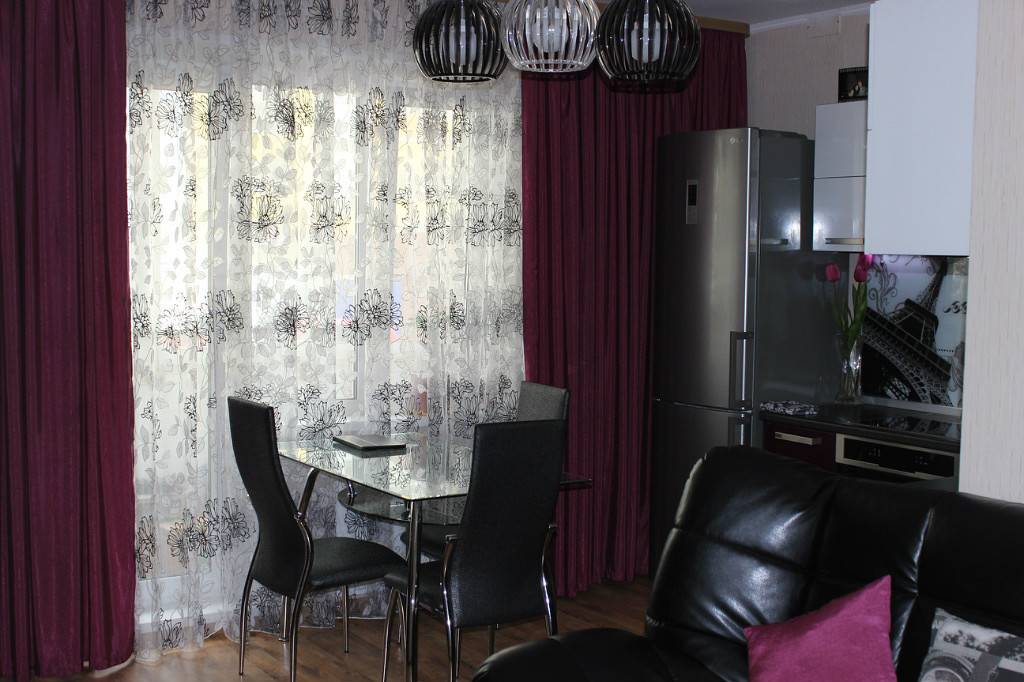 Узор «в горошек», клетка сочетается с однотонными шторами или со шторами с таким же орнаментом. Подходит для современного и классического стиля.